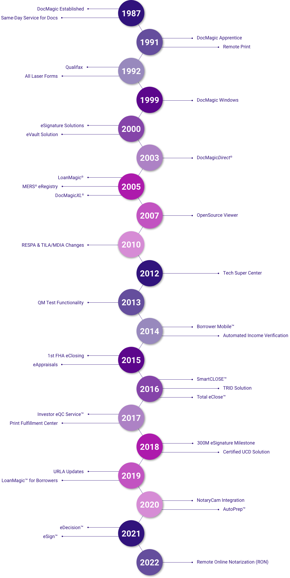 Founded in 1987, DocMagic has grown over the past 38 years to become a leading provider of document generation, automated compliance and digital transaction solutions for the national mortgage industry. Scroll through our timeline of innovation milestones to learn more about DocMagic's products and services.